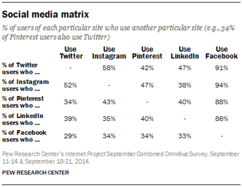 According to a Go-Globe Infographic, smartphone users have on average 7.4 social/communication apps on their phones. It’s a safe bet that most Twitter users are also on another social network. [UPDATE: According to this Pew Research Study the number of Twitter users who also use Facebook is 91%.]